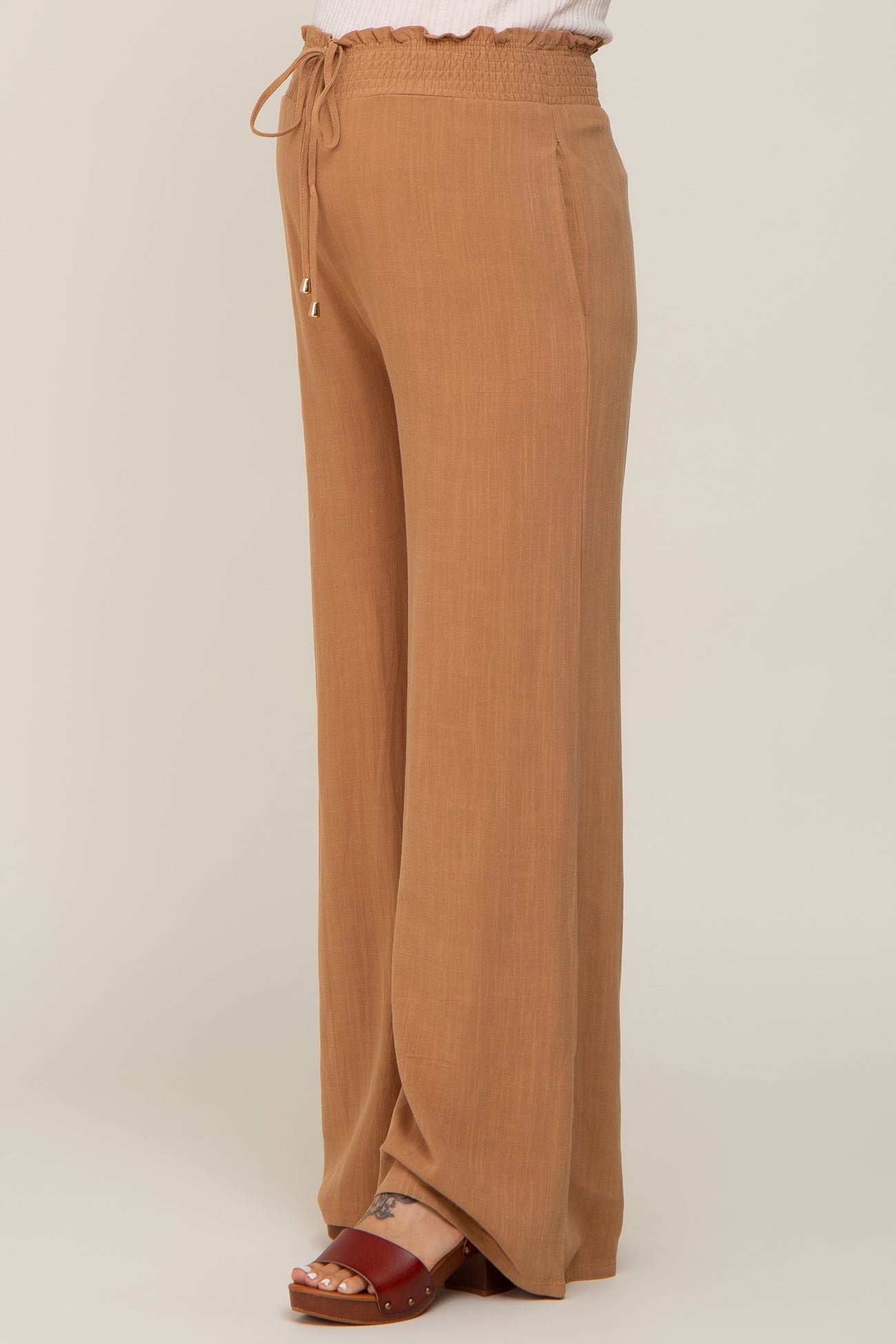 Camel Smocked Waist Wide Leg Linen Maternity Pants
