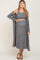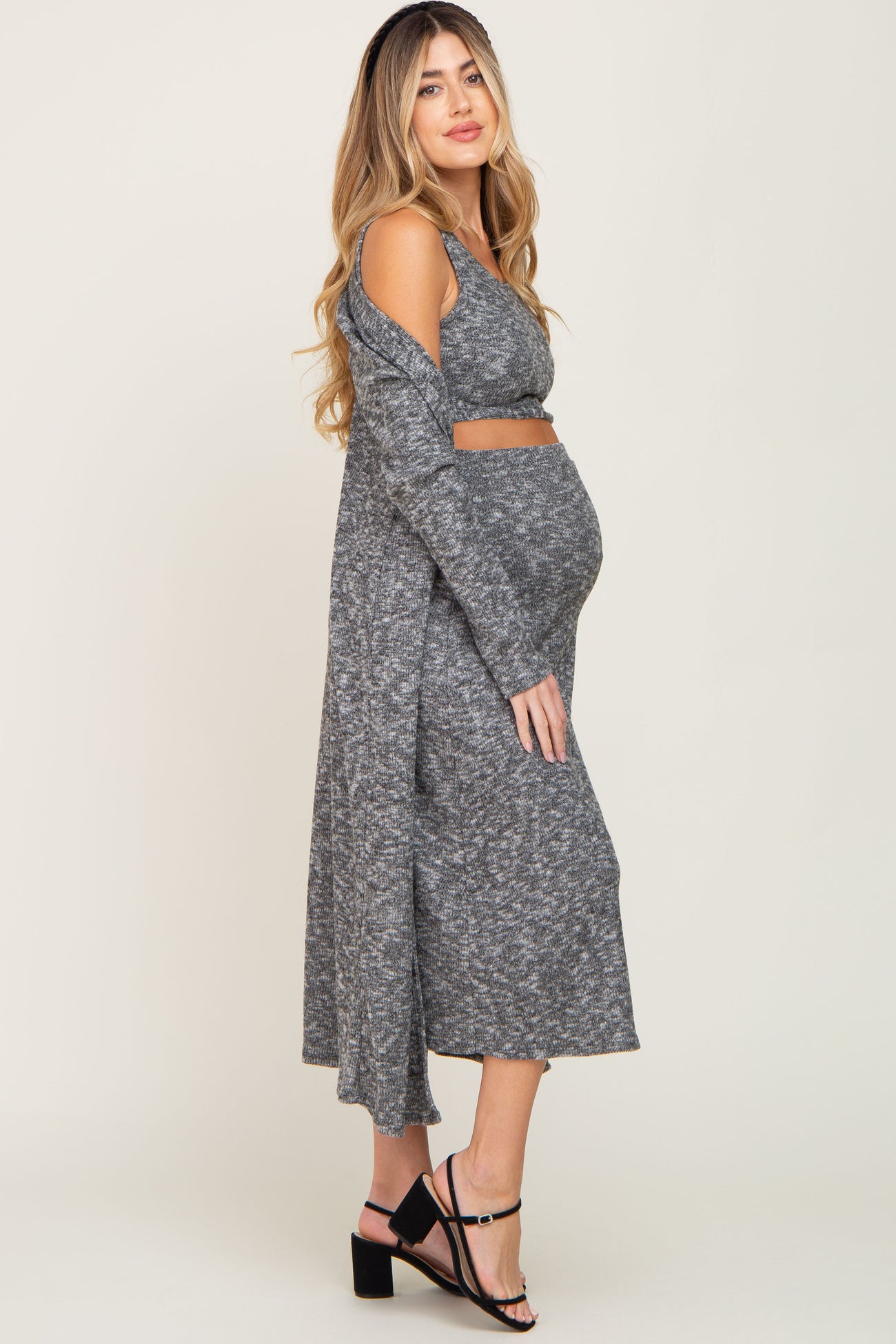 Details A heathered 3-piece, ribbed maternity set that includes a crop top, a long cardigan, and a midi skirt. Content + Care