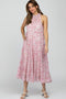 A solid knit maternity plus dress with button decor and ruffle trim in front.