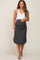 A solid maternity skirt with side ruching and a rounded hemline with side slits.