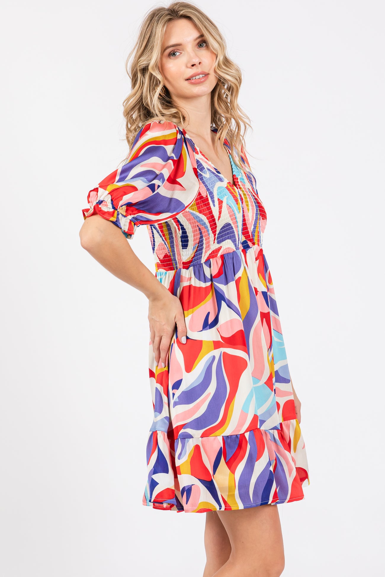 Details A printed dress with a smocked bust, puff sleeves and ruffle hem. Dress is double lined. Content + Care