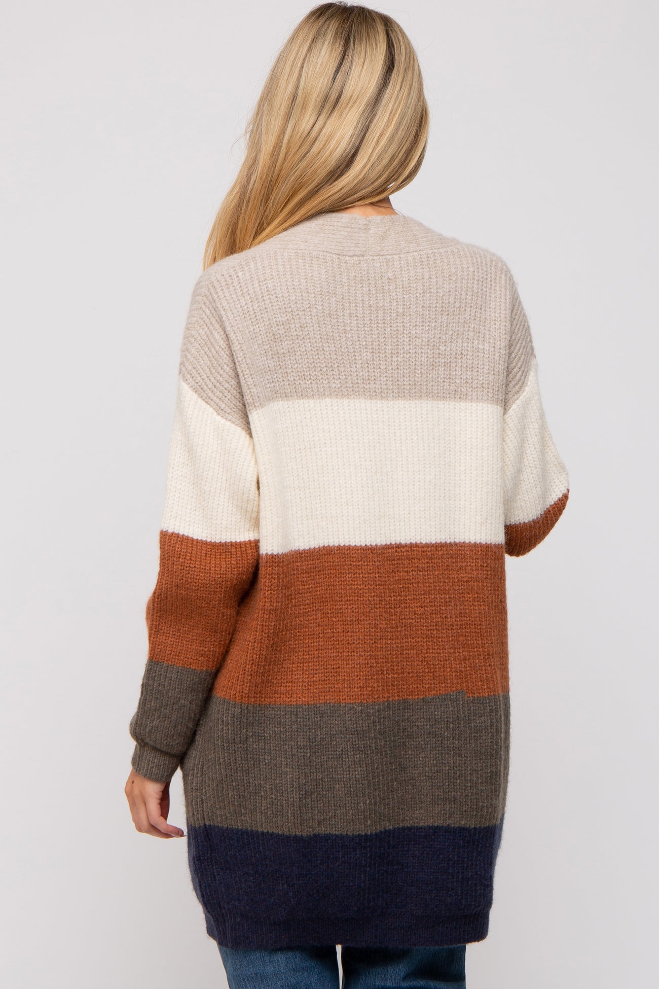 A color blocked, soft knit maternity cardigan featuring long sleeves and two front pockets.