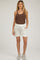 A pair of solid hued maternity shorts featuring a drawstring waist and side pockets.