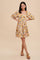 A floral print dress featuring a squared neckline, short puff sleeves, a back loop tie, a back cutout, a side zipper closure, and a gathered bottom hem. Piping accents along the neckline, under the bust, and on the botton tier. Dress is fully lined.