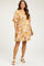 A floral print maternity dress featuring a squared neckline, short puff sleeves, a back loop tie, a back cutout, a side zipper closure, and a gathered bottom hem. Piping accents along the neckline, under the bust, and on the botton tier. Dress is fully lined.