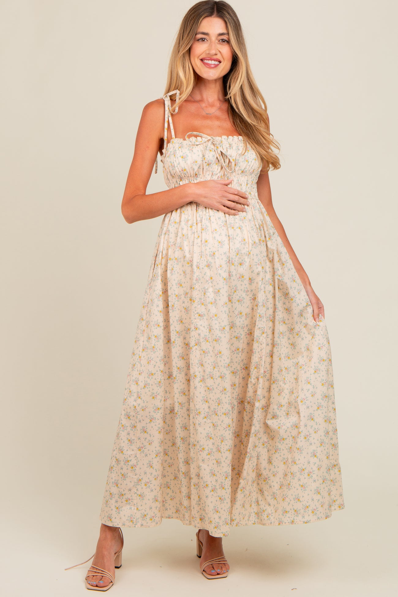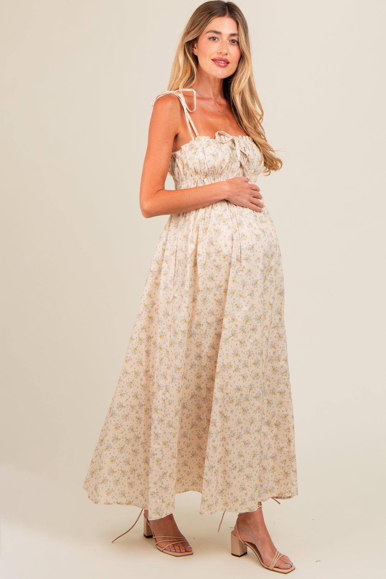 Cream Floral Ruched Bust Shoulder Tie Maternity Maxi Dress