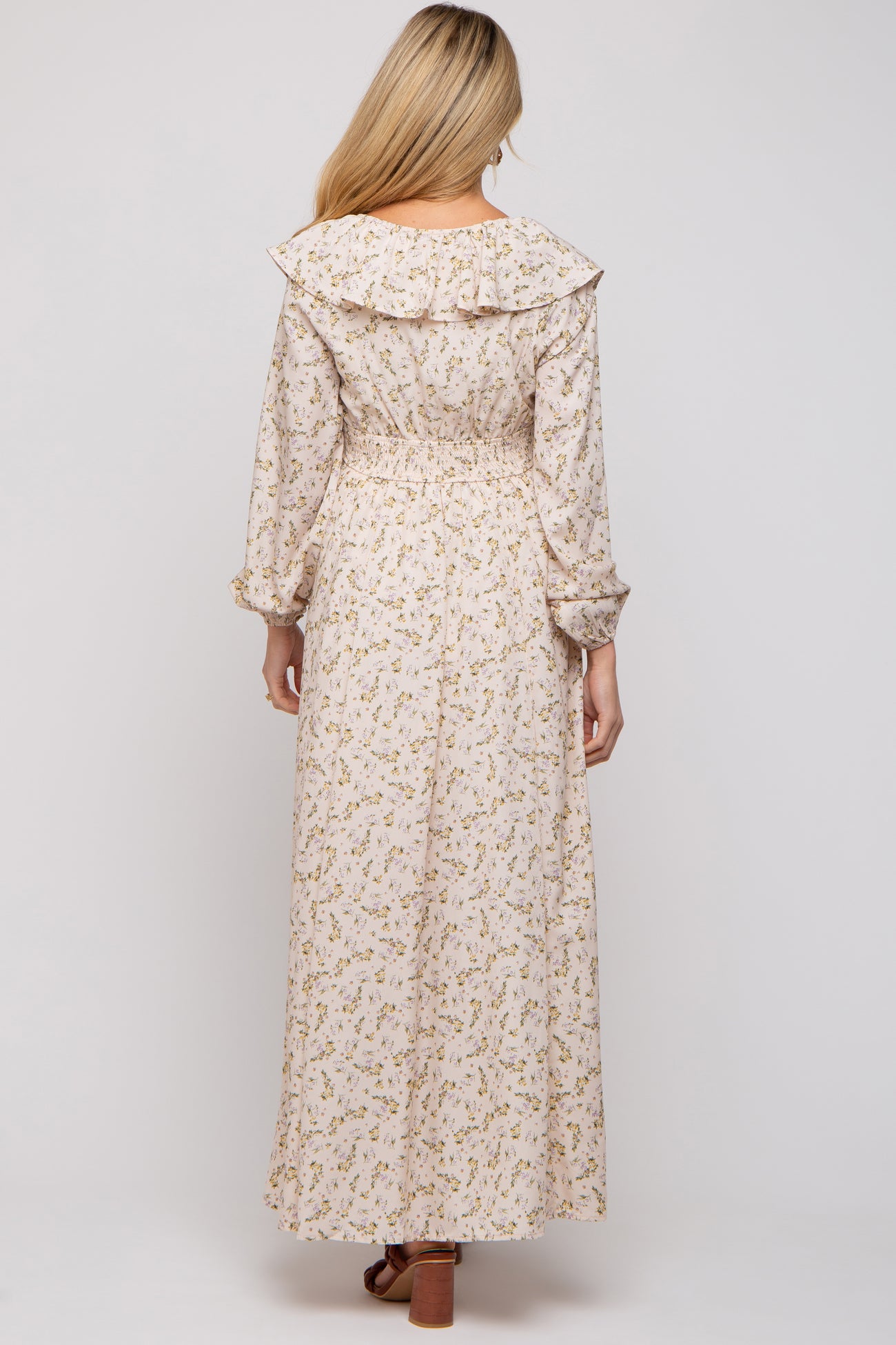 Cream Floral Ruffle V-Neck Wrap Front Maternity Maxi Dress