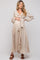 A floral print maternity maxi dress featuring a wrap front v-neckline with ruffle trim, long puff sleeves, and adjustable waist tie and a front slit with ruffle trim.