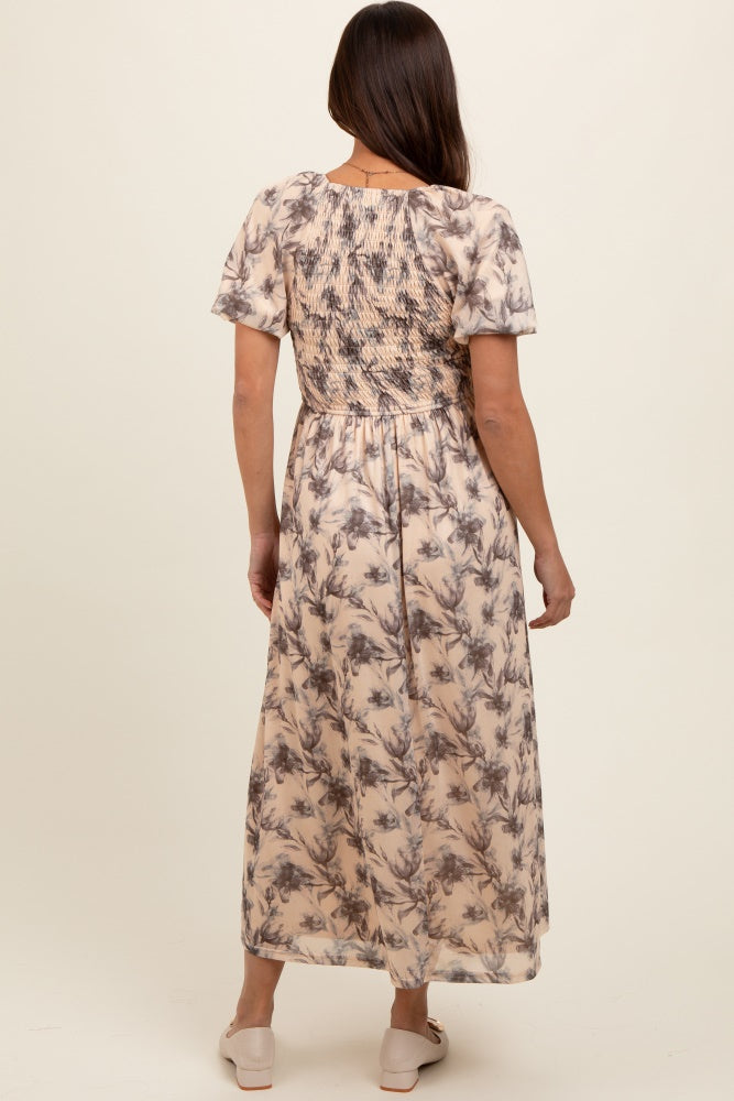 Cream Floral Smocked Short Puff Sleeve Maternity Midi Dress