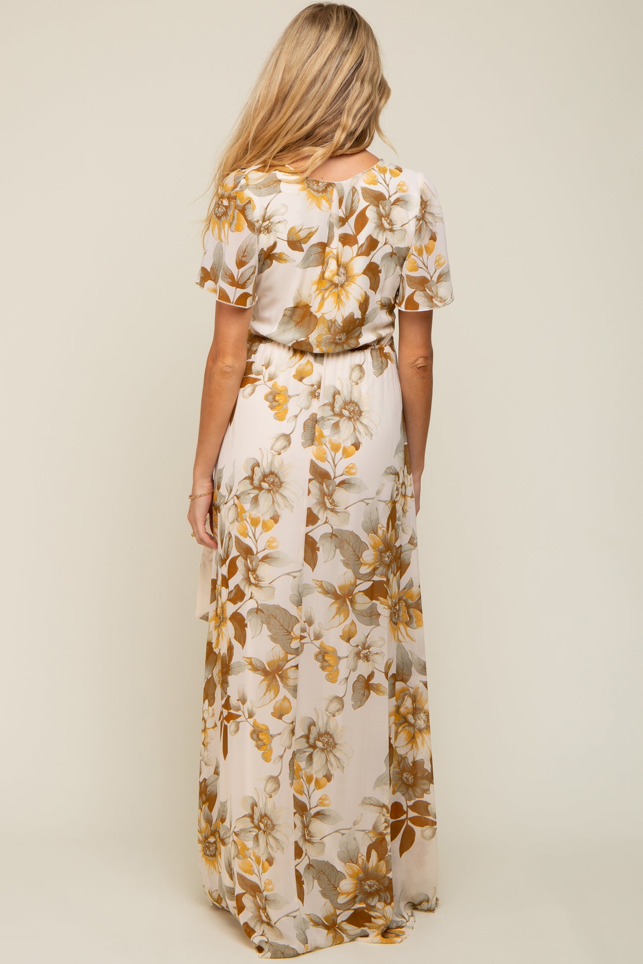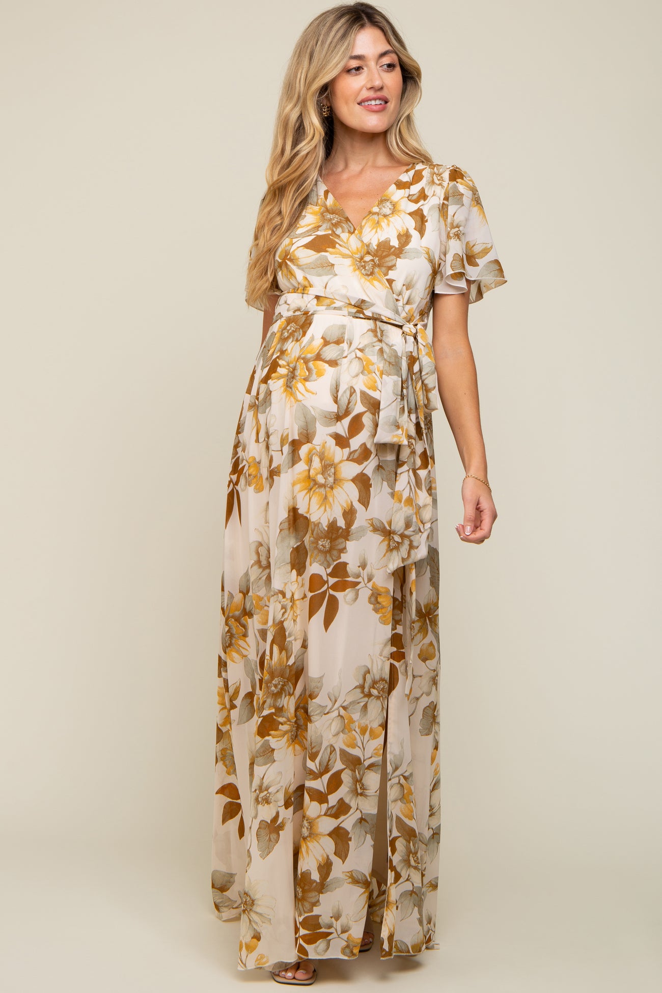 A floral print maternity maxi dress featuring a wrap v-neckline, short sleeves, a self-tie waist and side slits. Double lined.