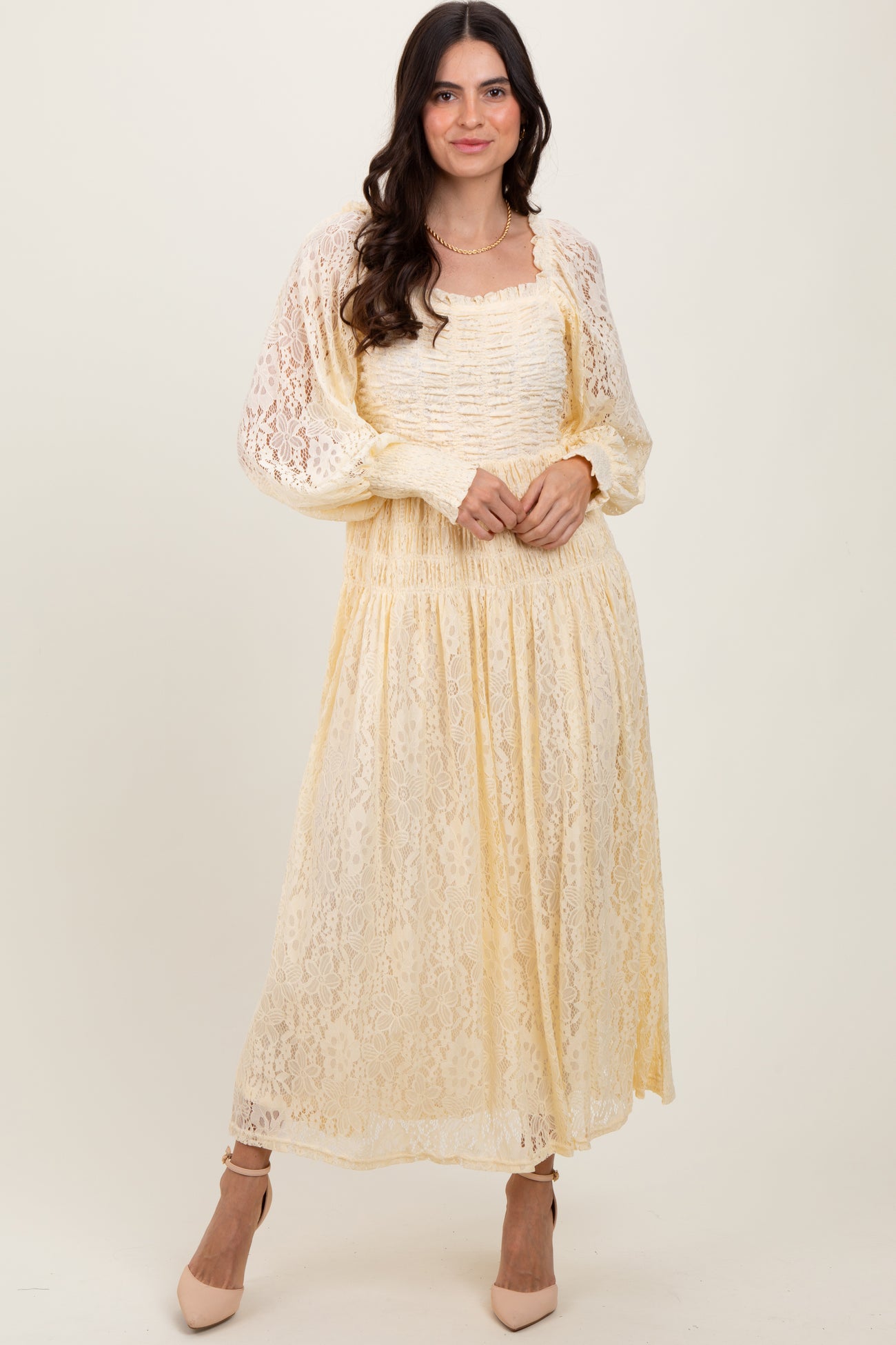 Cream Lace Smocked Bubble Sleeve Maternity Maxi Dress