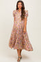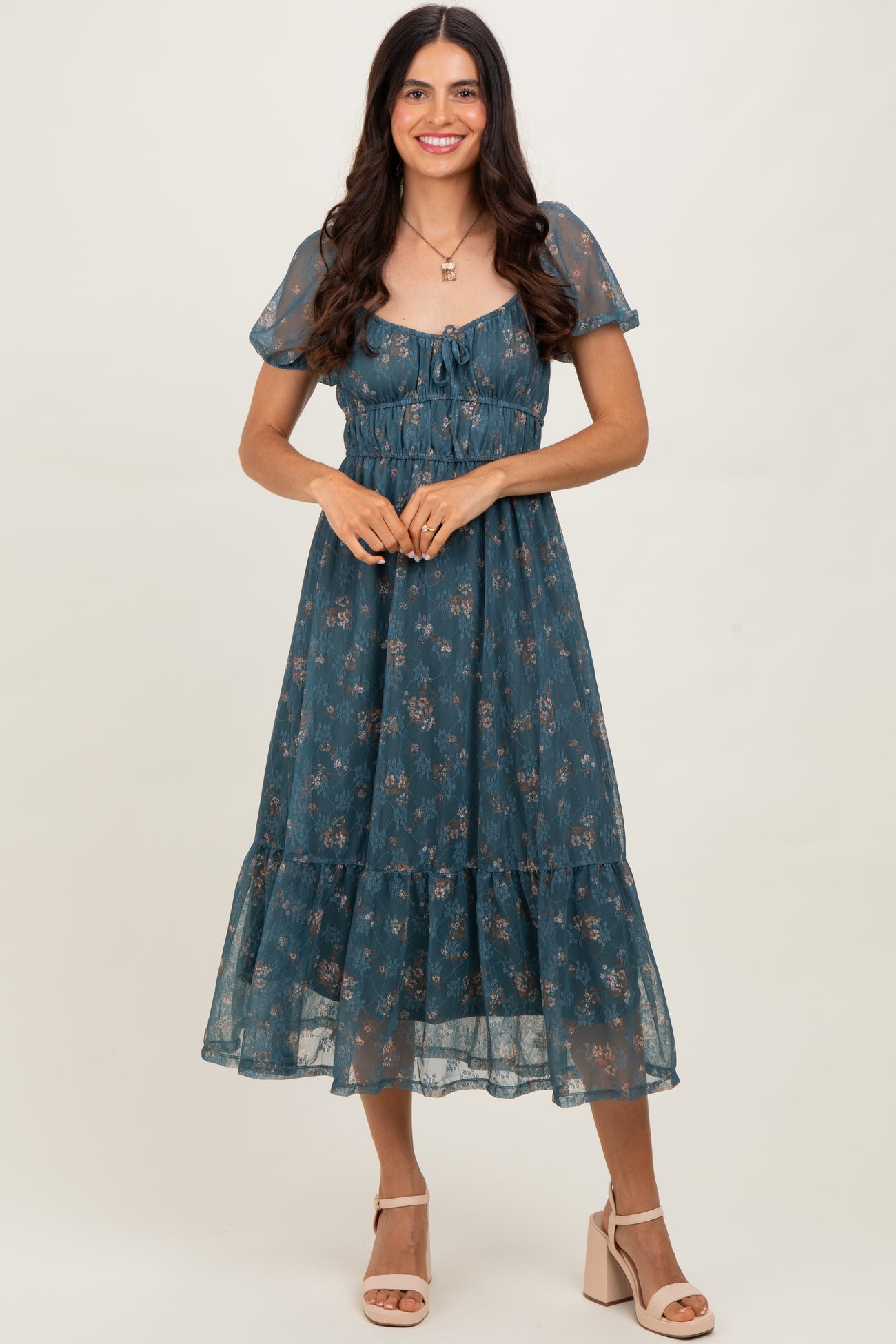 Deep Teal Floral Lace Overlay Puff Sleeve Maternity Midi Dress
