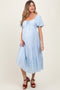 A solid hued maternity midi dress featuring short smocked sleeves, a tiered body, a ruffle hem and a v-neckline.