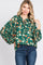 A floral blouse with a front tie, a ruffle accent neckline, and long puff sleeves with ruffle accents. Top is partially lined.