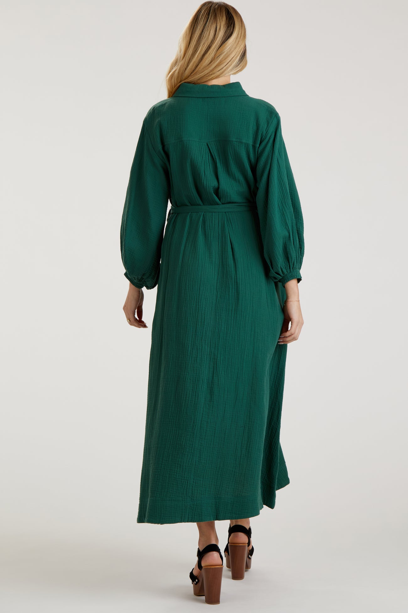 A gauze maternity midi dress featuring a collared neckline, 3/4 length puff sleeves, a button down front and an adjustable belted tie at the waist.