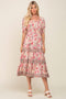 A maternity midi dress featuring a slight sweetheart neckline, a front tie accent, shirred bodice, short puff sleeves, side pockets and a tiered skirt.