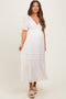 A solid maternity maxi dress featuring functioning front buttons, a collar, two front pockets, cuffed short dolman sleeves, and a hi-low rounded hemline.