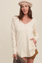 A linen dress with short dolman sleeves, front functioning buttons, a collar, and side pockets.