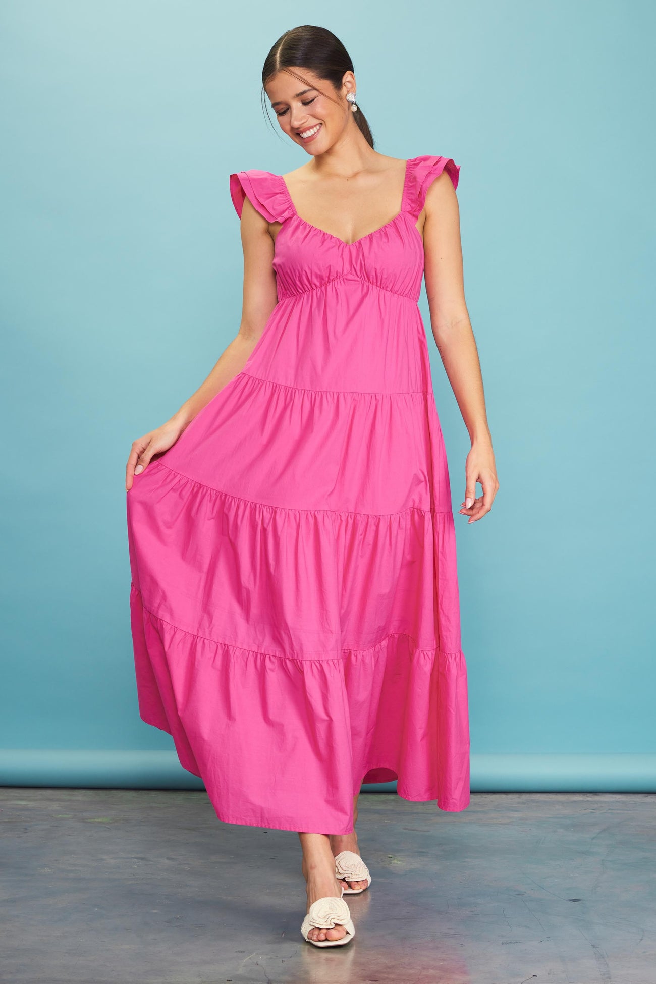 A solid sleeveless maxi dress featuring flutter shoulder straps, a tiered body and a v-neckline.