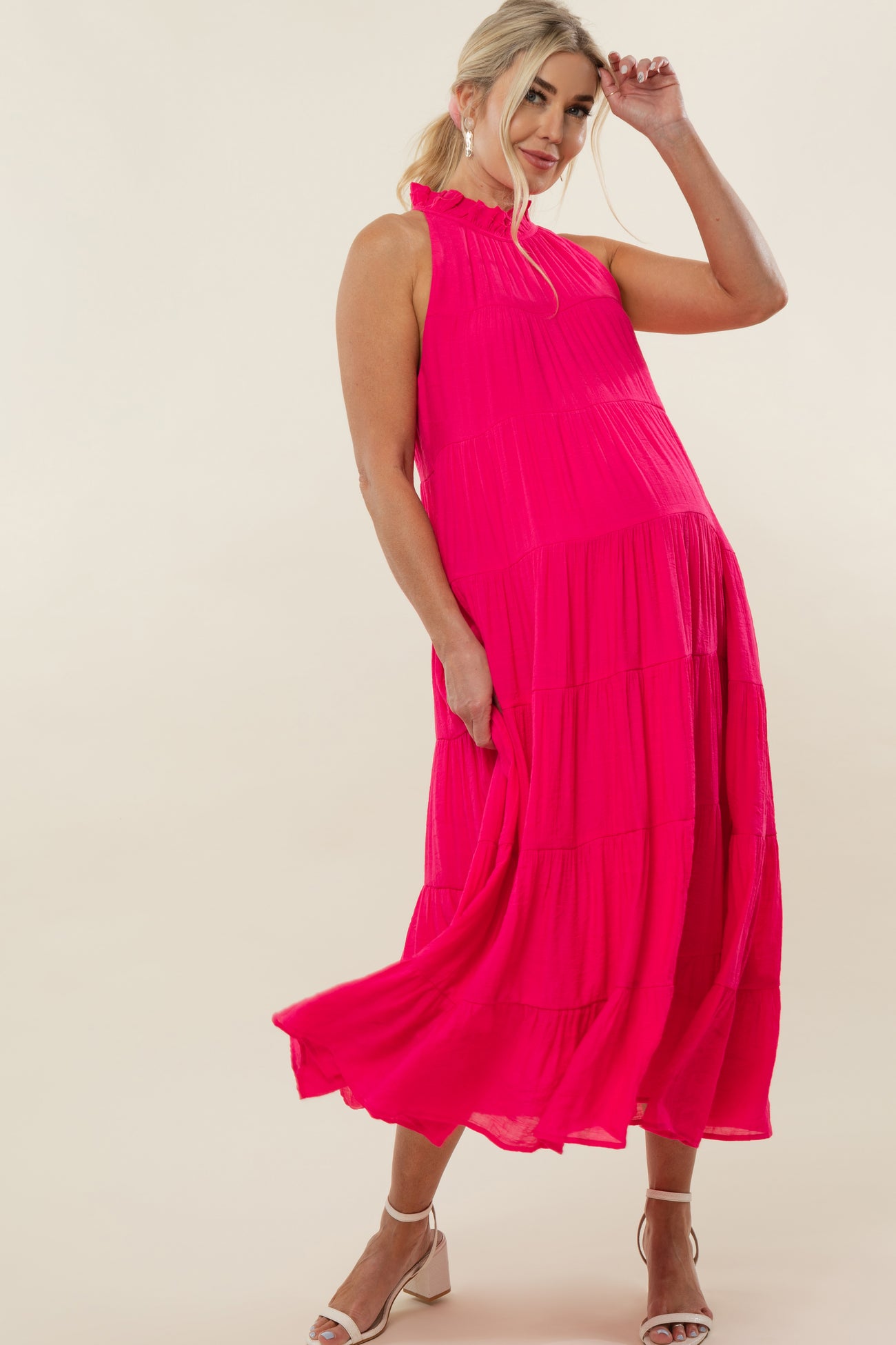 Fuchsia Tiered High Neck Maternity Maxi Dress