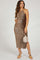 A burnout velvet, sparkle maternity midi dress. Features a halter neckline, a crisscross back tie, and a side slit. Dress is partially lined.