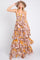 A floral maxi dress with a smocked top, a straight neckline, a tie under the bust, and adjustable straps, and a flounce tiered skirt. Dress is lined 3/4 of the way down.