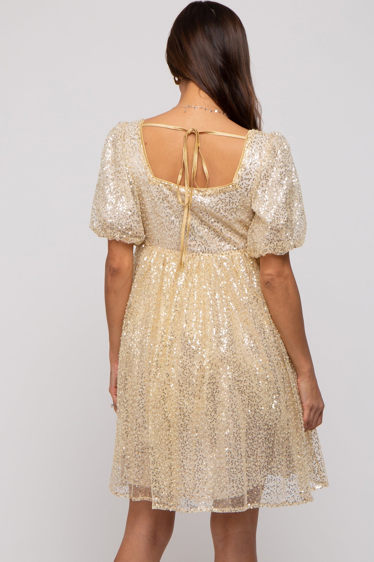 Gold Sequin Pearl Embellished Square Neck Babydoll Maternity Dress