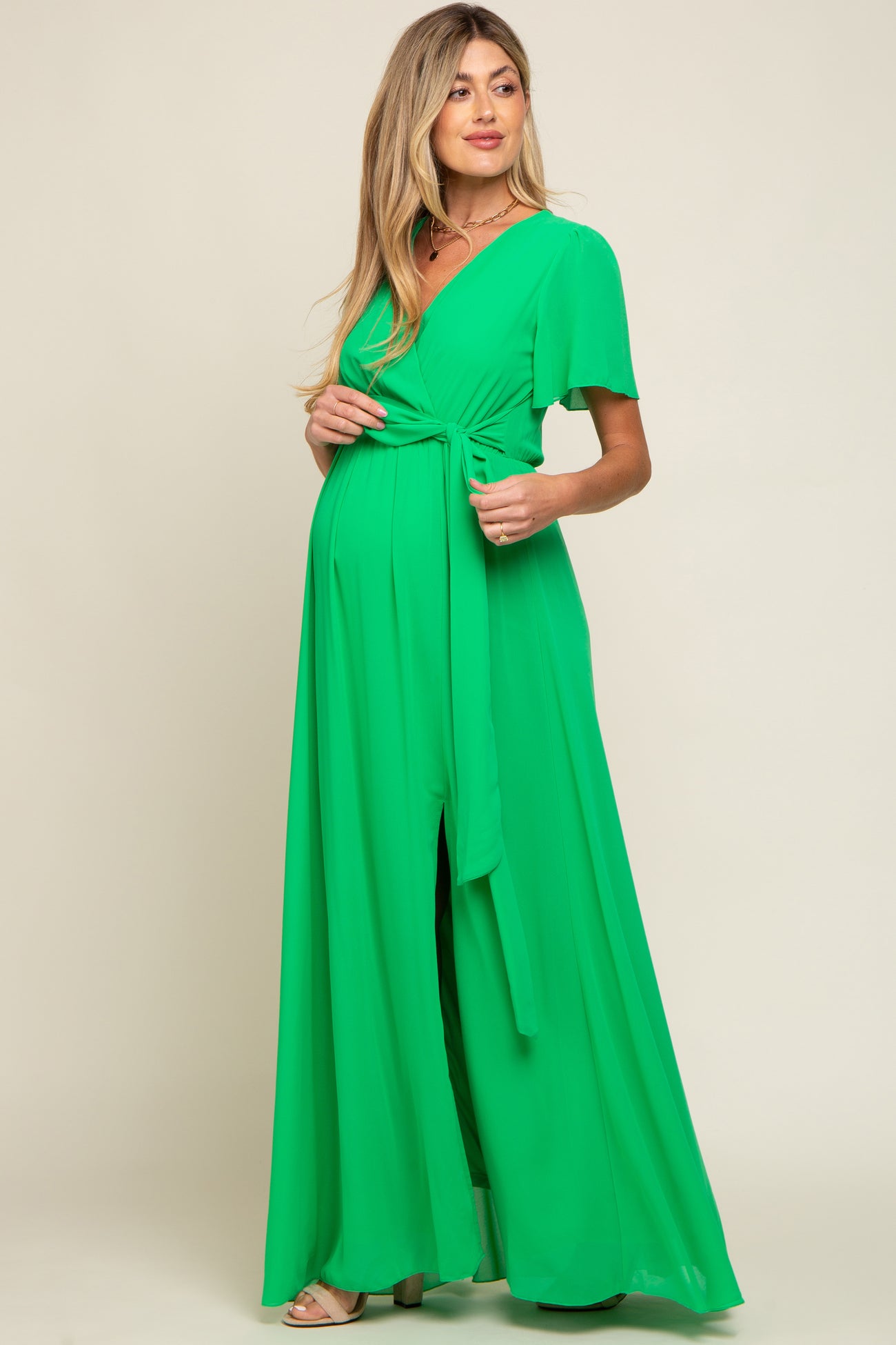 Green Chiffon Short Sleeve Wrap V-Neck Front Slit Maternity Maxi Dress