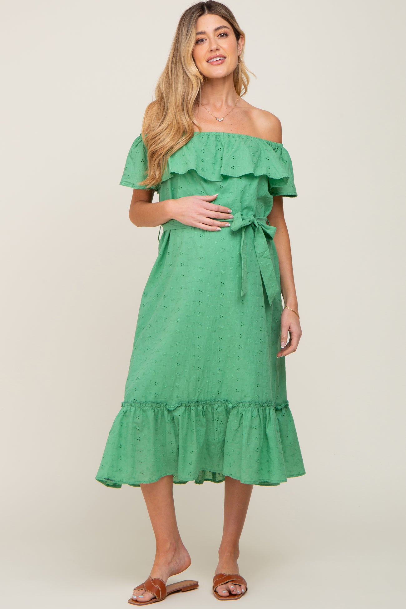 Green Eyelet Embroidered Ruffle Off Shoulder Maternity Midi Dress