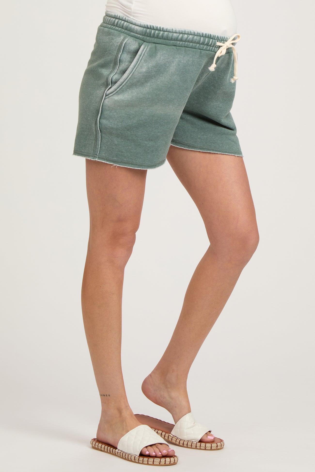 Details A faded wash pair of maternity drawstring shorts with two side pockets. Content + Care