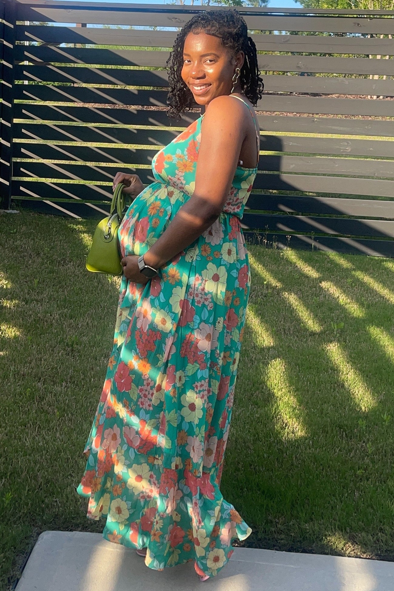 A floral chiffon maternity midi dress featuring a wrap front v-neckline with a snap button closure, adjustable straps, a smocked back and a hi-low skirt with ruffle trim. Double lined.