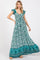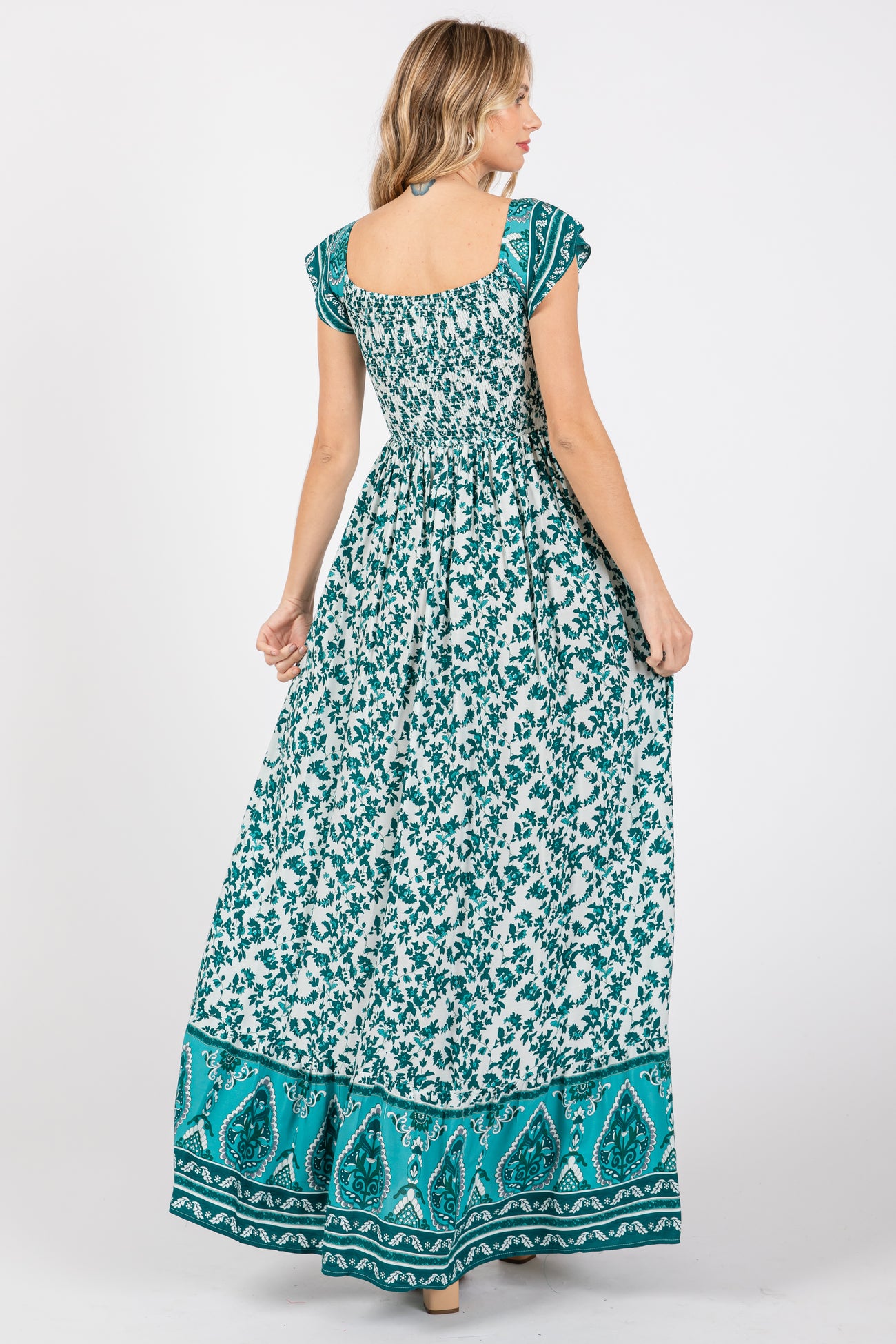 Floral smocked maxi dress featuring an off-shoulder neckline, a front drawstring, with ruffle cap sleeves.