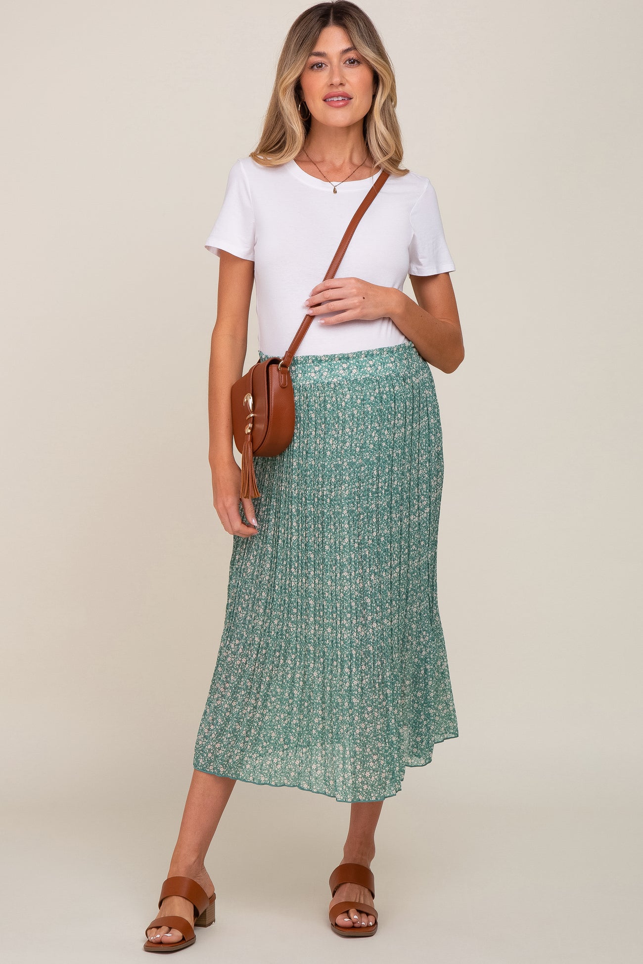 Green Floral Pleated Maternity Midi Skirt
