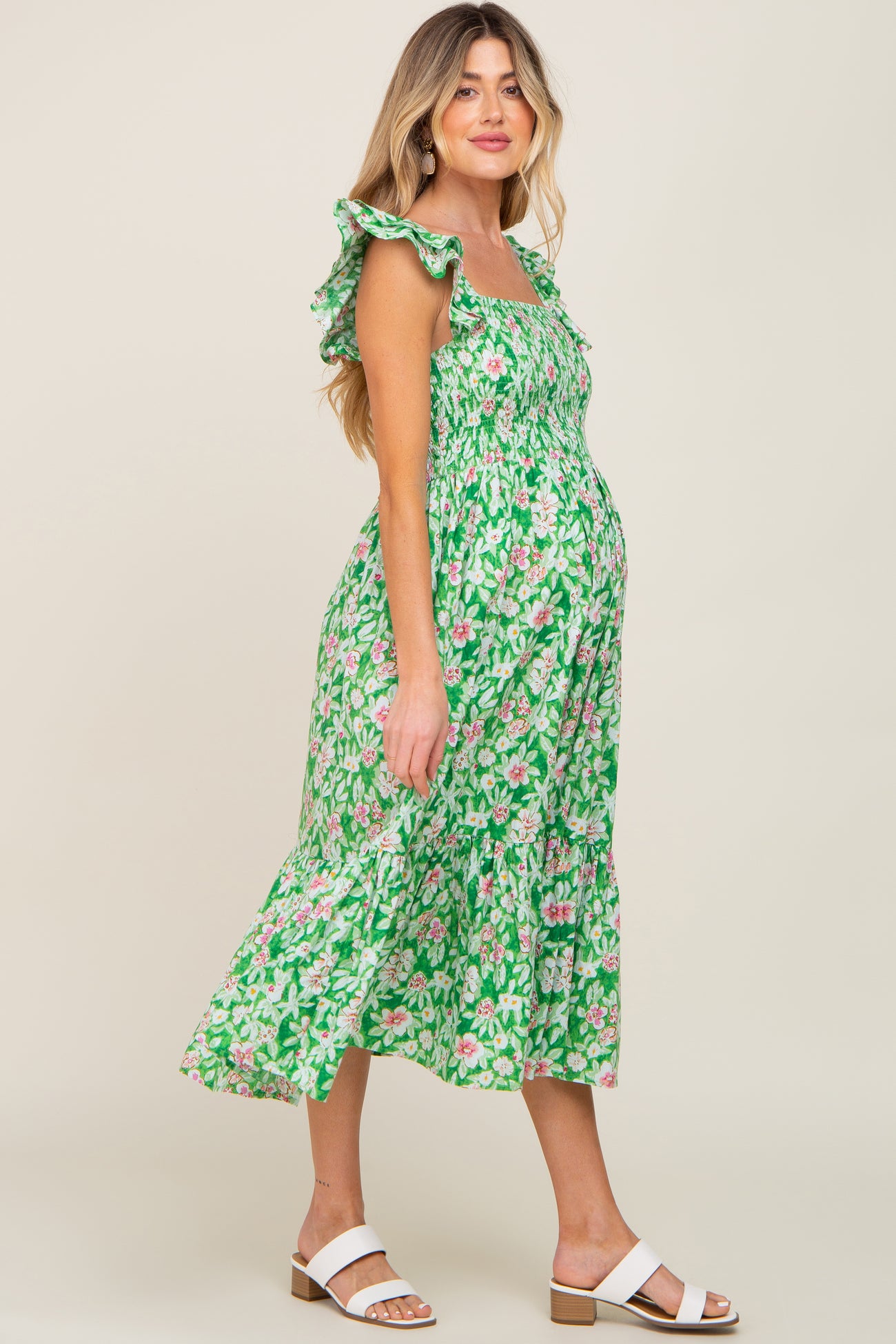 Green Floral Smocked Frill Sleeve Maternity Midi Dress