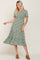 A floral midi dress featuring a smocked bodice, an off the shoulder neckline, short sleeves, and a tiered skirt.