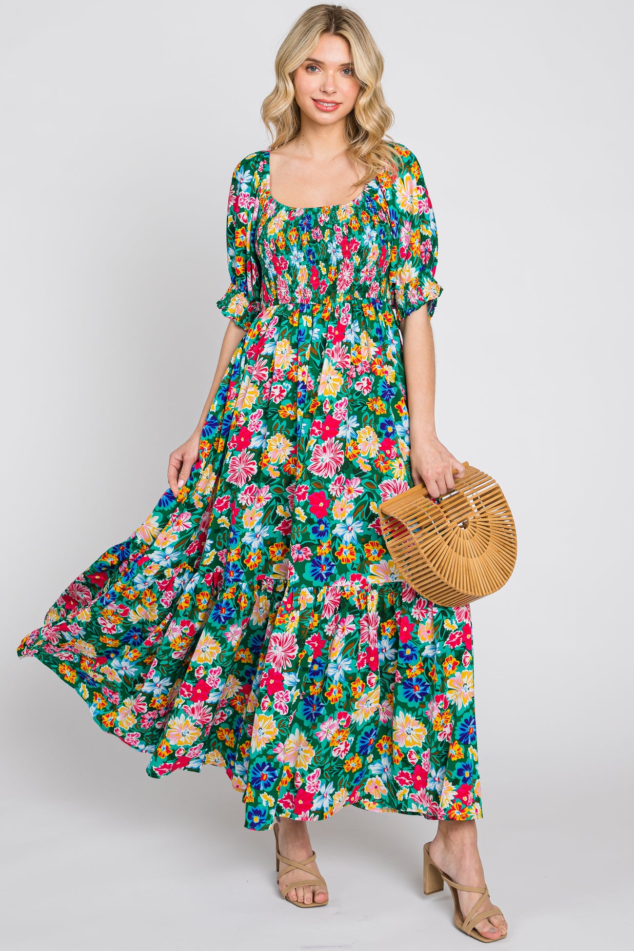 Green Floral Smocked Puff Sleeve Maxi Dress