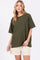 A solid hued top featuring an oversized fit, a front pocket and short sleeves.