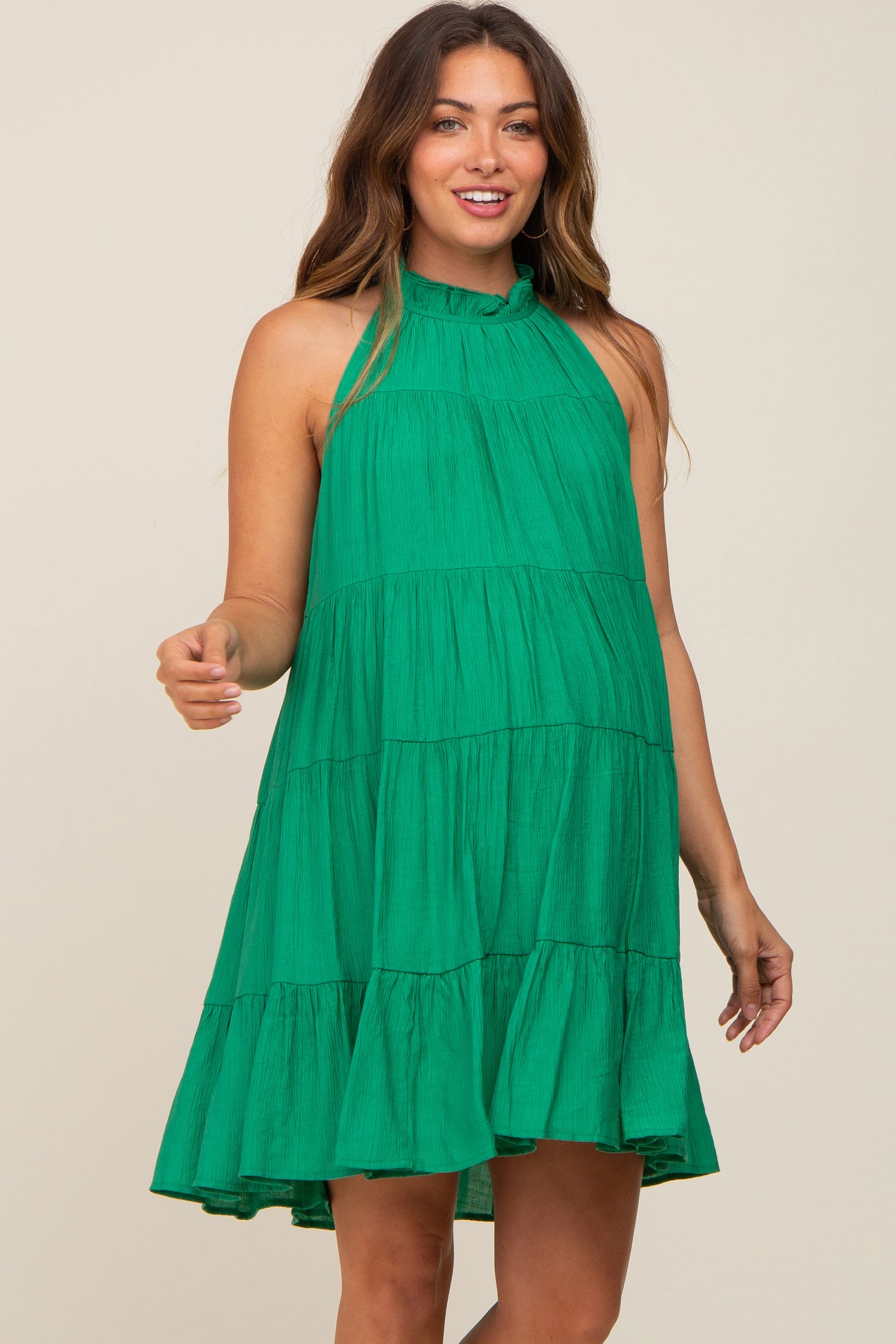 Green Ruffle Mock Neck Tiered Maternity Dress