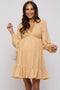 A solid hue maternity dress that features a ruffled mock neck, a tiered body, and a back tie. Dress is lined for extra coverage.