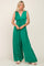 A satin jumpsuit featuring a v-neckline, an adjustable tie at the waist and side slits.
