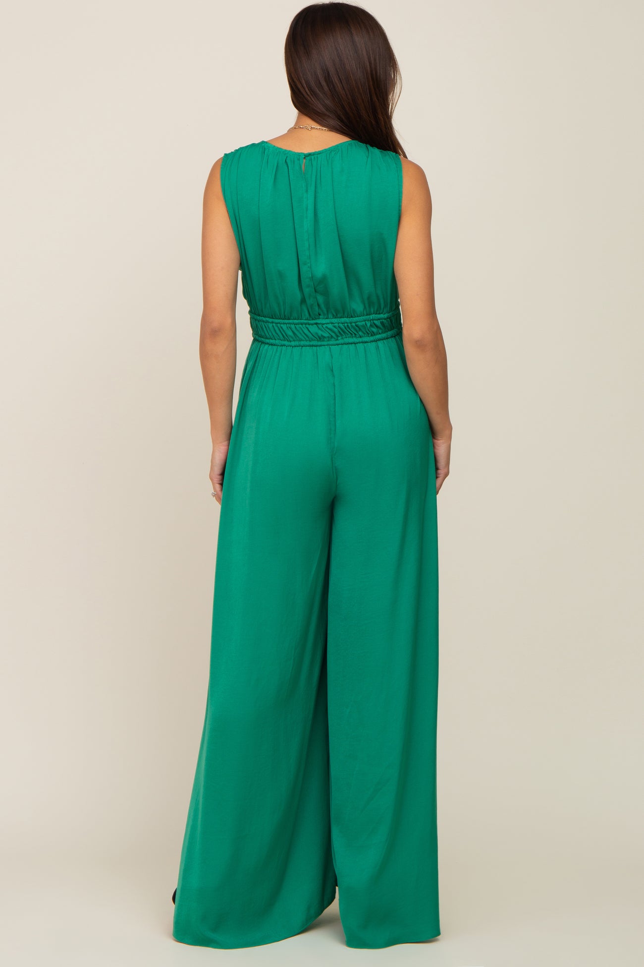 Green Satin V-Neck Side Slit Maternity Jumpsuit