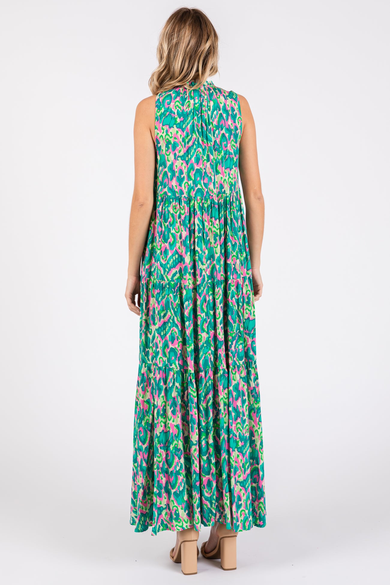 Green Sleeveless V-Neck Ruffle Neck Tiered Maxi Dress
