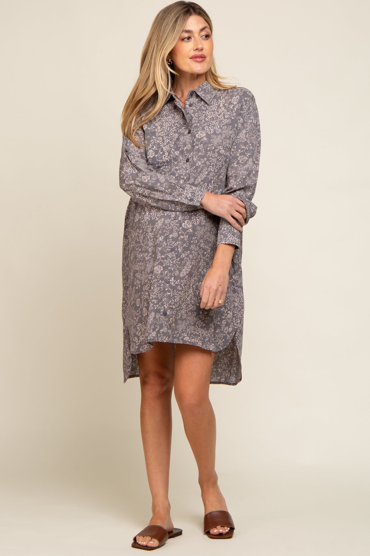 Grey Floral Button Up Long Sleeve Maternity Dress