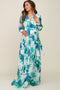 A floral maternity midi featuring a hi-lo rounded hem, side slurs, a lined skirt, and an off the shoulder flounce top.