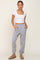 A solid sweatpant with an elastic waistband and elastic hem. Pocketed.