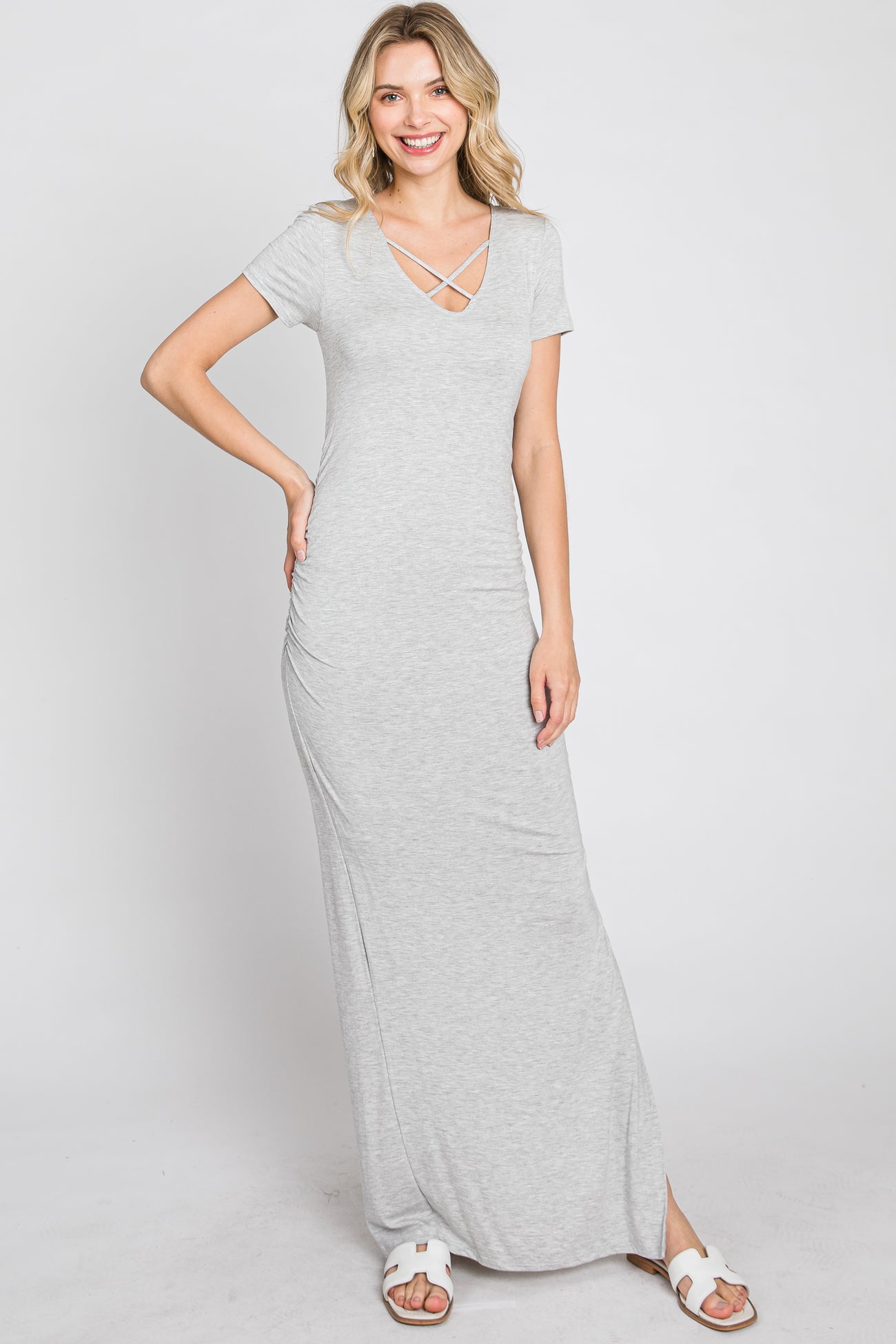 A heathered maxi dress featuring a cross front accent, short sleeves, ruched sides, and a side slit.