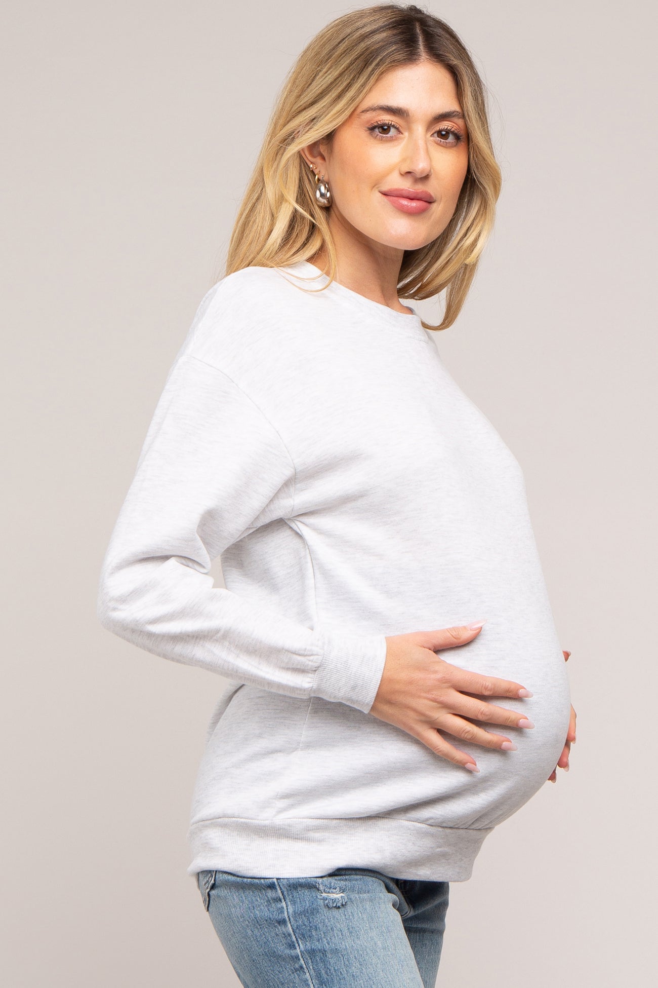 A heathered pullover maternity sweatshirt featuring long sleeves and a rounded neckline.