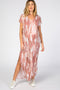 A solid short sleeve maternity maxi dress with a deep v-neckline, ruffle accent sleeves, button down closure in front and tie accent in back. Skirt is partially lined. Pocketed.
