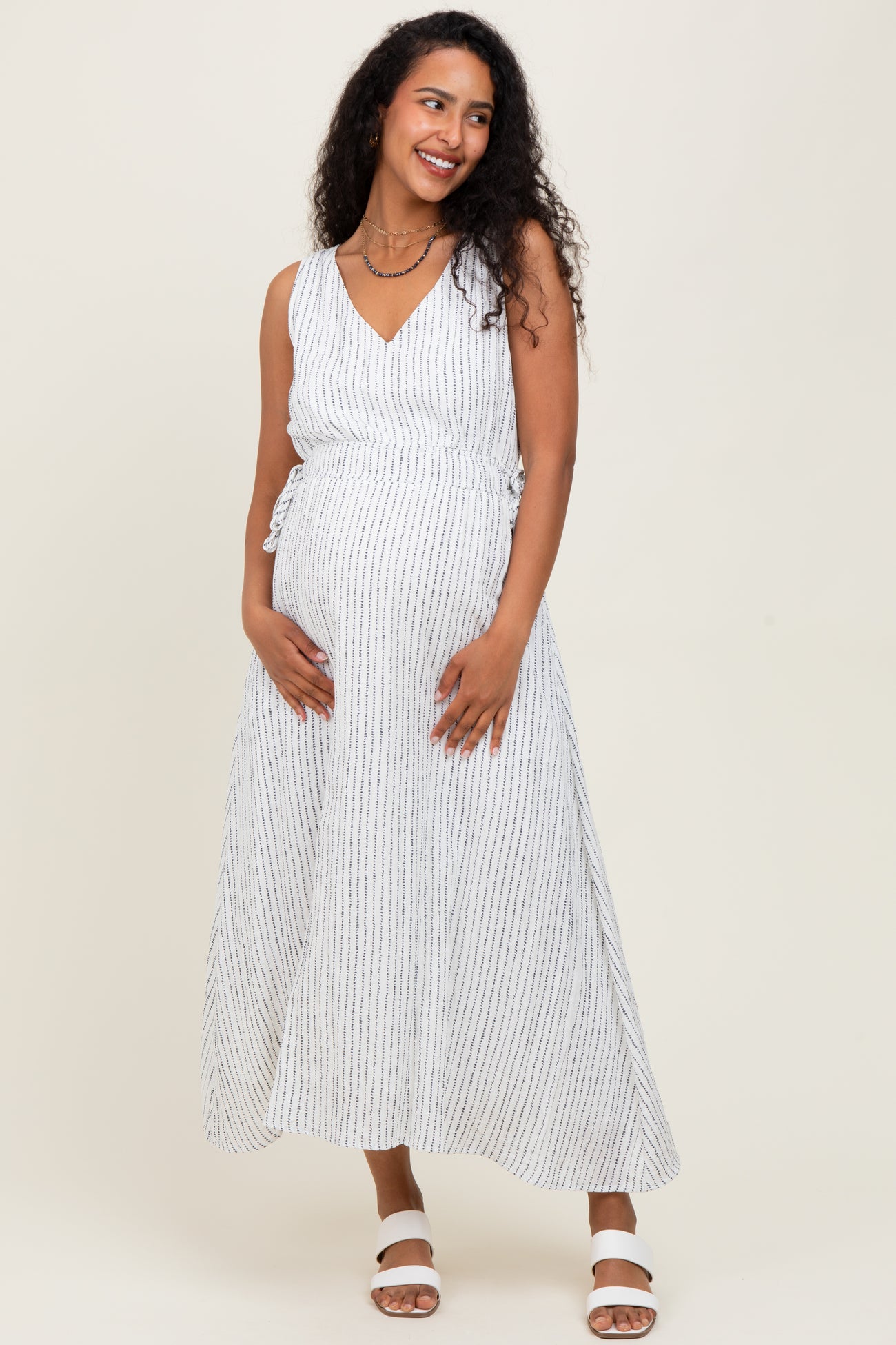 Ivory Dotted Stripe Side Tie Sleeveless Maternity Midi Dress