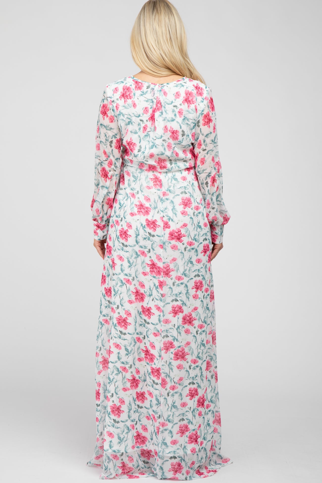 Ivory Floral Chiffon Long Sleeve Pleated Maternity Maxi Dress